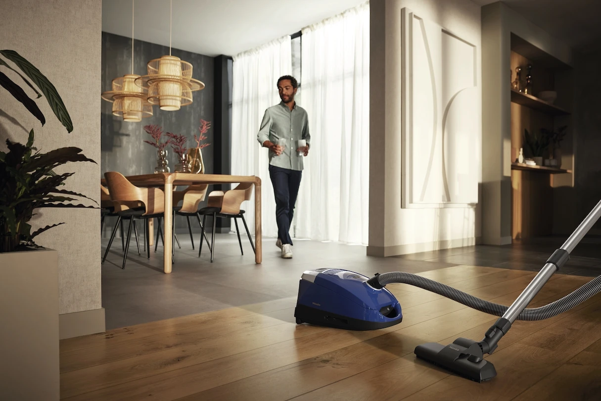 Aspirateur traîneau avec système compact pour un rangement dans un espace réduit.
