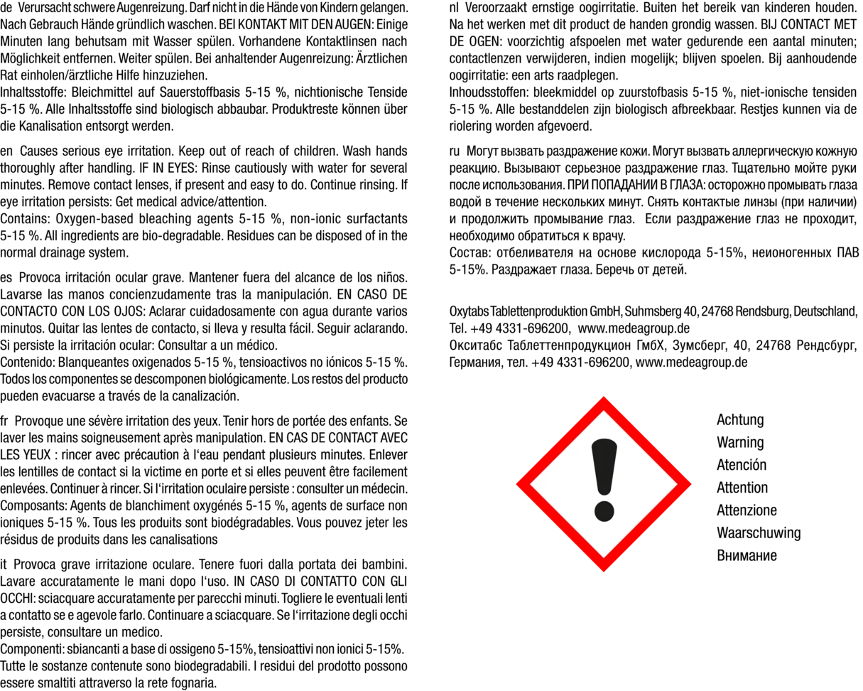 Attention. Provoque une sévère irritation des yeux. En cas de consultation d’un médecin, garder à disposition le récipient ou l’étiquette. Tenir hors de portée des enfants. EN CAS DE CONTACT AVEC LES YEUX: Rincer avec précaution à l’eau pendant plusieurs minutes. Enlever les lentilles de contact si la victime en porte et si elles peuvent être facilement enlevées. Continuer à rincer. Si l’irritation oculaire persiste: consulter un médecin.