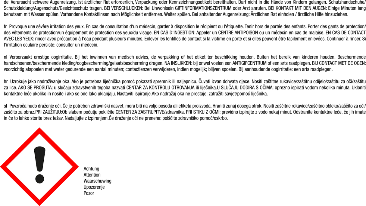 Attention. Provoque une sévère irritation des yeux. En cas de consultation d’un médecin, garder à disposition le récipient ou l’étiquette. Tenir hors de portée des enfants. EN CAS DE CONTACT AVEC LES YEUX: Rincer avec précaution à l’eau pendant plusieurs minutes. Enlever les lentilles de contact si la victime en porte et si elles peuvent être facilement enlevées. Continuer à rincer. Si l’irritation oculaire persiste: consulter un médecin. Contient subtilisine. Peut produire une réaction allergique.