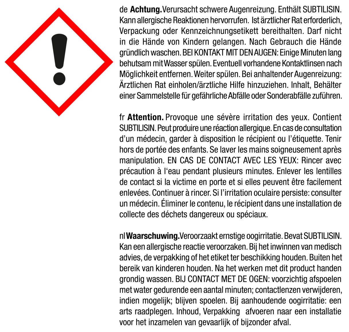 Attention. Provoque une sévère irritation des yeux. En cas de consultation d’un médecin, garder à disposition le récipient ou l’étiquette. Tenir hors de portée des enfants. Se laver les mains soigneusement après manipulation. EN CAS DE CONTACT AVEC LES YEUX: Rincer avec précaution à l’eau pendant plusieurs minutes. Enlever les lentilles de contact si la victime en porte et si elles peuvent être facilement enlevées. Continuer à rincer. Si l’irritation oculaire persiste: consulter un médecin. Contient SUBTILISIN. Peut produire une réaction allergique. BAUA N-80287