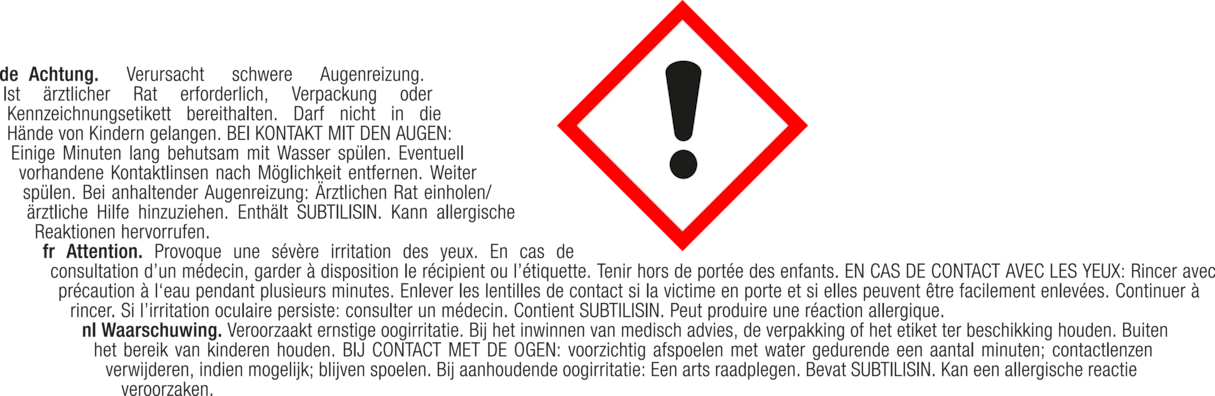 Attention. Provoque une sévère irritation des yeux. En cas de consultation d’un médecin, garder à disposition le récipient ou l’étiquette. Tenir hors de portée des enfants. EN CAS DE CONTACT AVEC LES YEUX: Rincer avec précaution à l’eau pendant plusieurs minutes. Enlever les lentilles de contact si la victime en porte et si elles peuvent être facilement enlevées. Continuer à rincer. Si l’irritation oculaire persiste: consulter un médecin. Contient SUBTILISIN. Peut produire une réaction allergique.